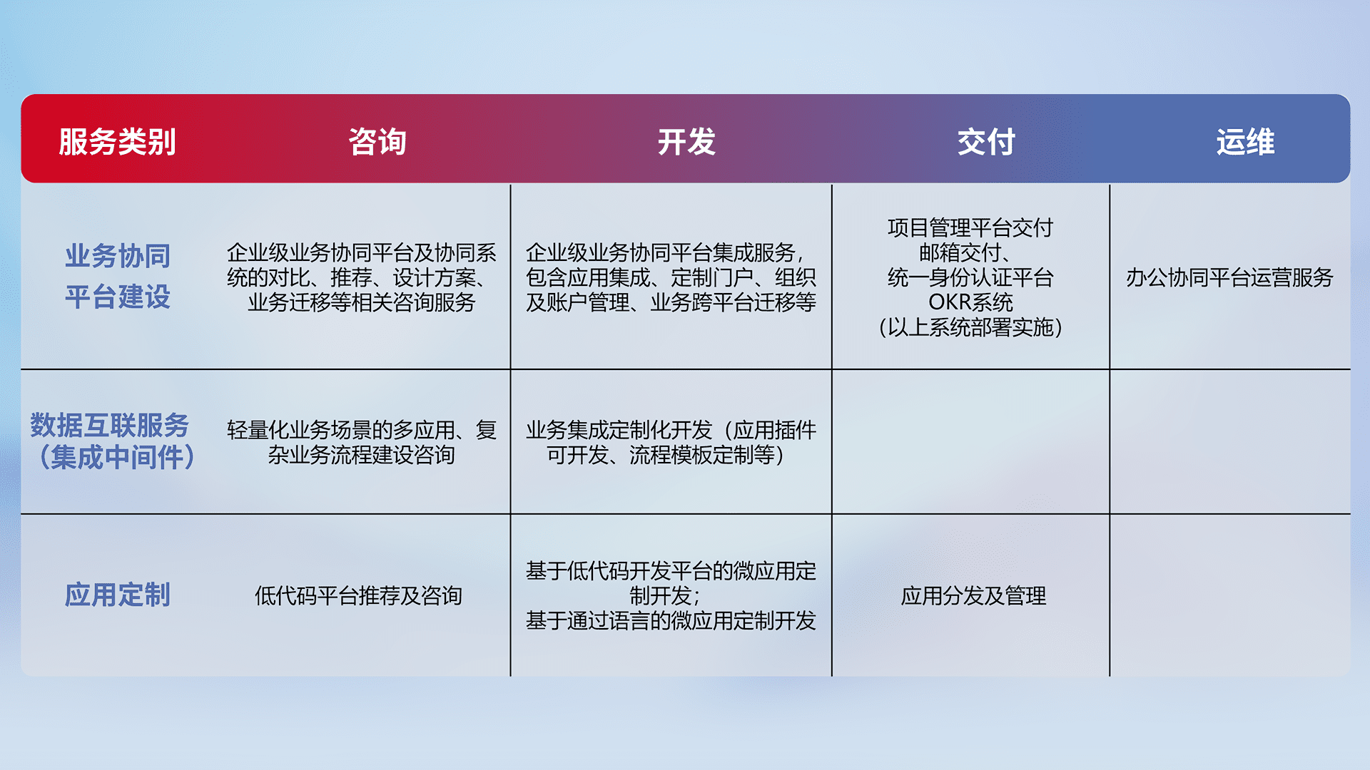 针对钉钉、、、、企微、、IDaas等平台级产品提供产品的规划、、、方案、、、、交付、、、定制化开发等服务,,实现如统一协同办公、、、、智能客户服务、、、混合会议管理、、、、智能数据查询、、、、等业务场景,,,实现数字化转型。。。。
